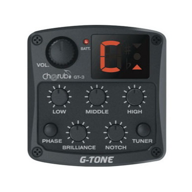 GT-3 is a 4 band EQ with Chromatic tuner, feedback-fighting notch and phase effect. The visible portion of GT-3 is only 52mm*54mm*4mm. Low battery message will be displayed when the battery is getting low. The high definition LED display.